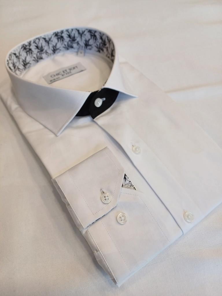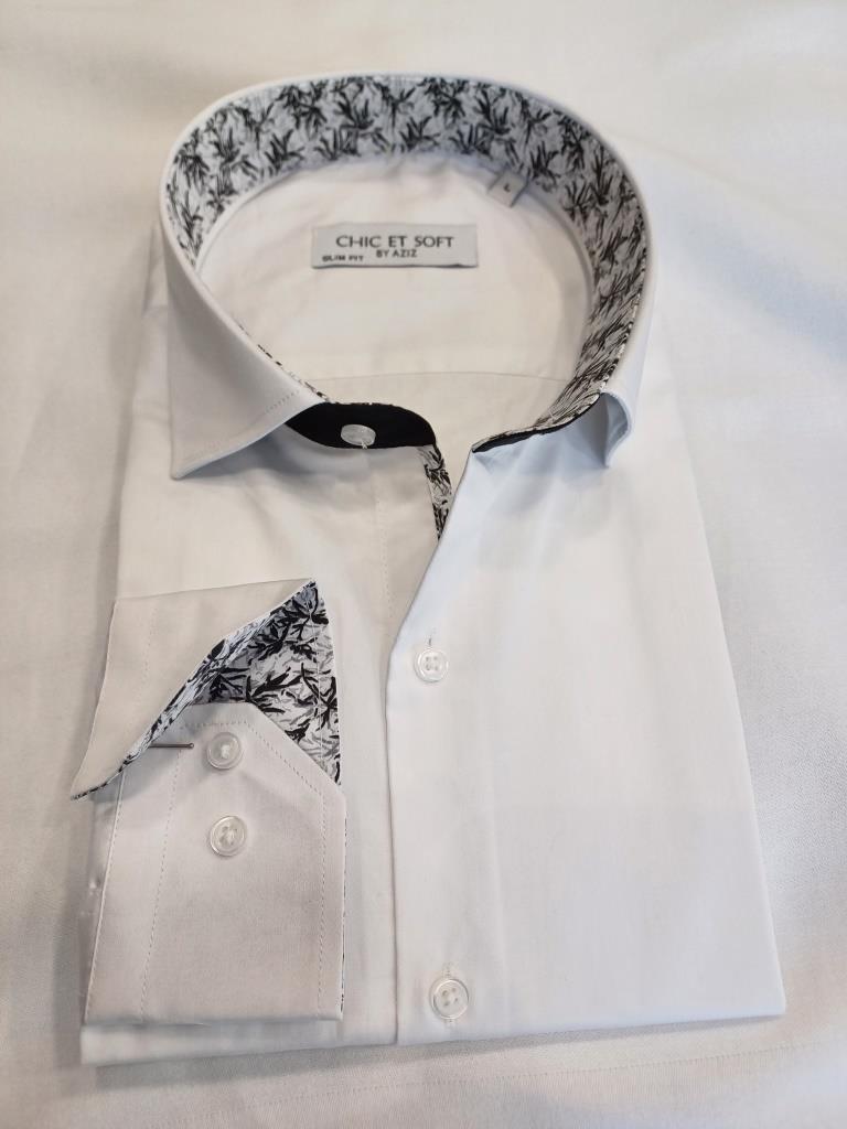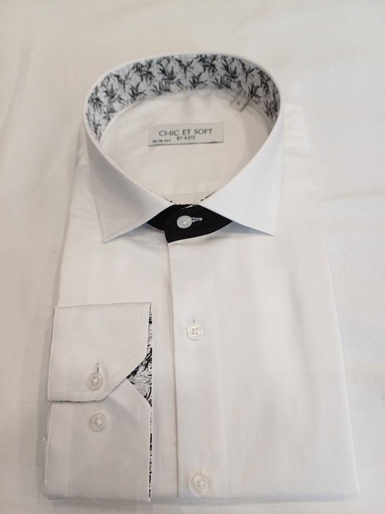 Chemise blanche encolure motif floral noir gorge noir bouton blanc